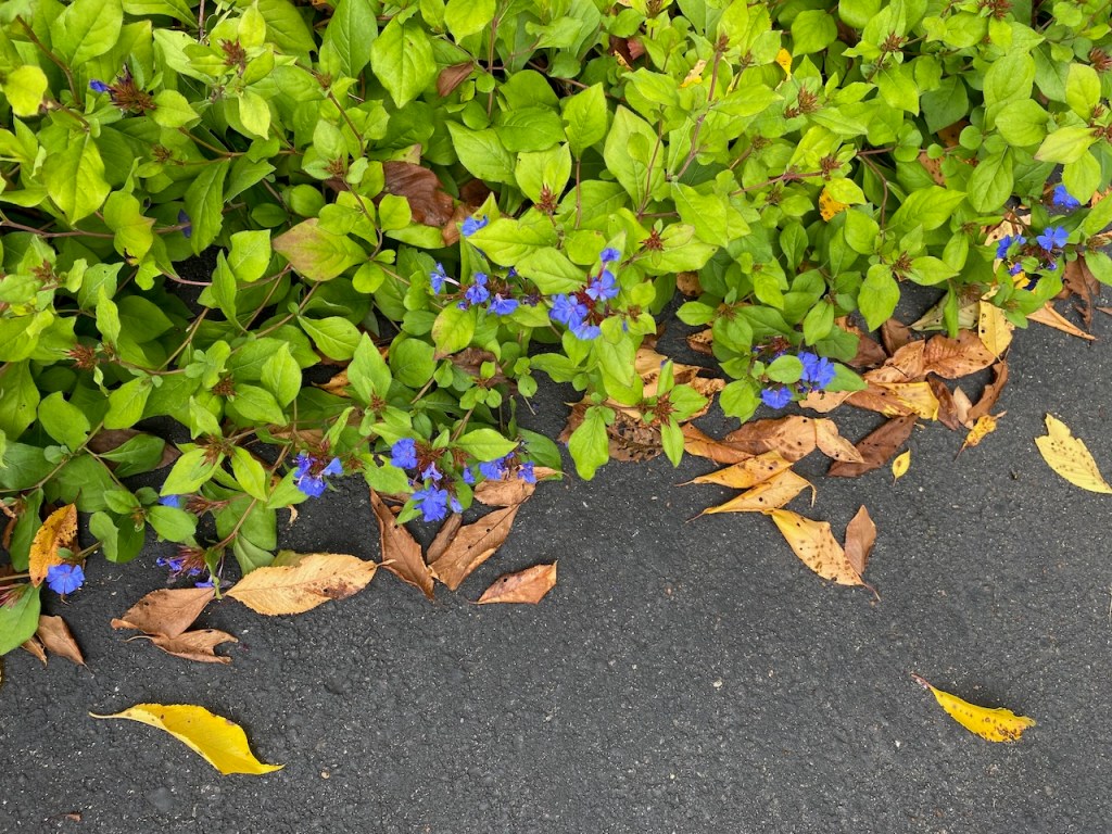 The buck had left when I went outside with my camera. Beside the front door the ceratostigma has begun to flower, but overhead the leaves of the weeping cherry have started to turn and fall. The front path and the driveway are edged with blue and maize. Football season can’t be far behind.