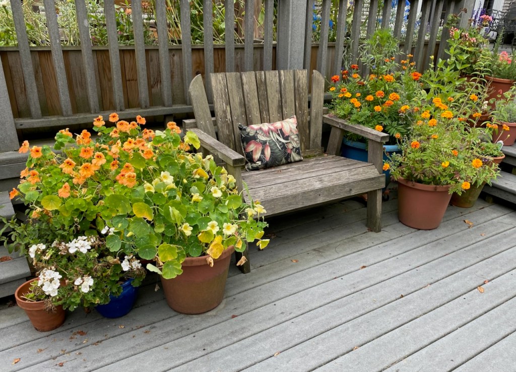 Up here on my deck where I will see them all the time, I’ve planted flowers whose whole point is to be beautiful. They are attractive to bees, hummingbirds, and butterflies, yes, but more modest flowers would please those pollinators just as well.