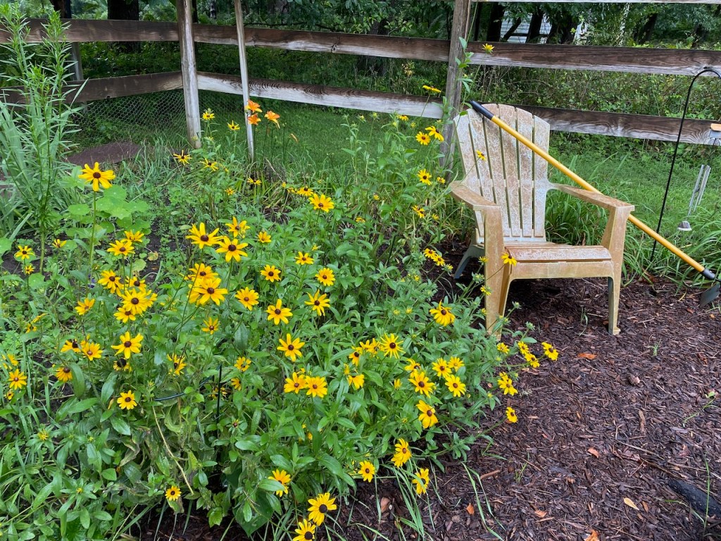 Meanwhile, the deer were eating my rudbeckia in the front yard, so I planted some inside the fenced garden. So of course now they’re leaving the ones out front alone. Well, if that’s what it takes… I saw an eight point buck under the crabapple tree yesterday, but that’s okay if the deer eat the crabapples. Keeps them out of the flowerbeds. I still resent it, though, that with all the bucks tromping through my yard, rubbing bark off the trees and decimating the hydrangeas, not one has had the courtesy to drop his antlers in my yard.