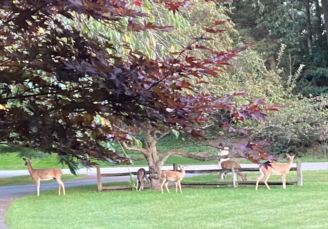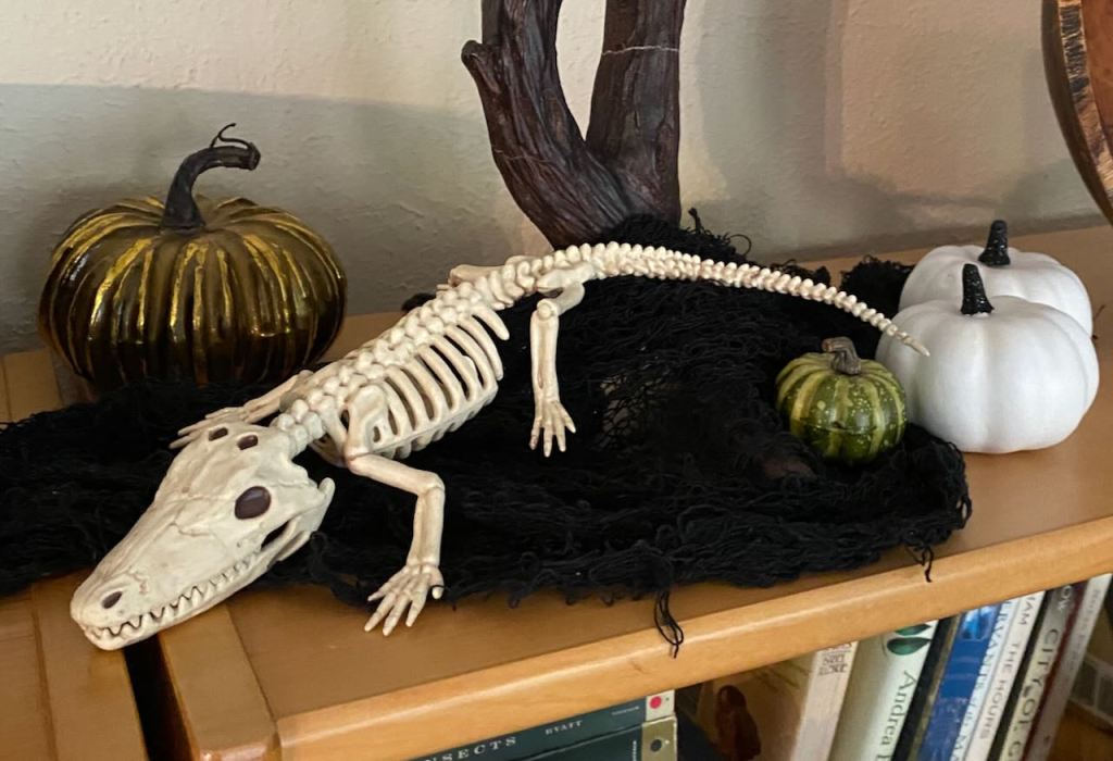 Then I put out a skeletal creature with a toothy grin to darken things back down. All the pumpkins in his photo are fake, so no overdoing of the pumpkin farm was involved. Overdoing of craft shops and Halloween pop-up stores, maybe yes.