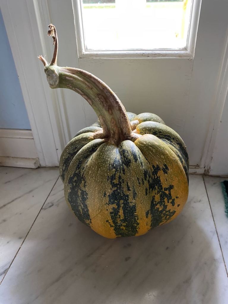 This American Tondo had great color shifts, and a super-beefy stem amusingly out of proportion to its snug round shape. It seemed dignified and comical, both at once. Its name, too – and being into words as I am, I had to look that up. Its formal name is Tonda Padania, tonda being Italian for round, and Padania a valley in Italy. All pumpkins originate in the Americas, but this variety is said to have been developed in Italy. American Tondo could be a compromise, or an argument.