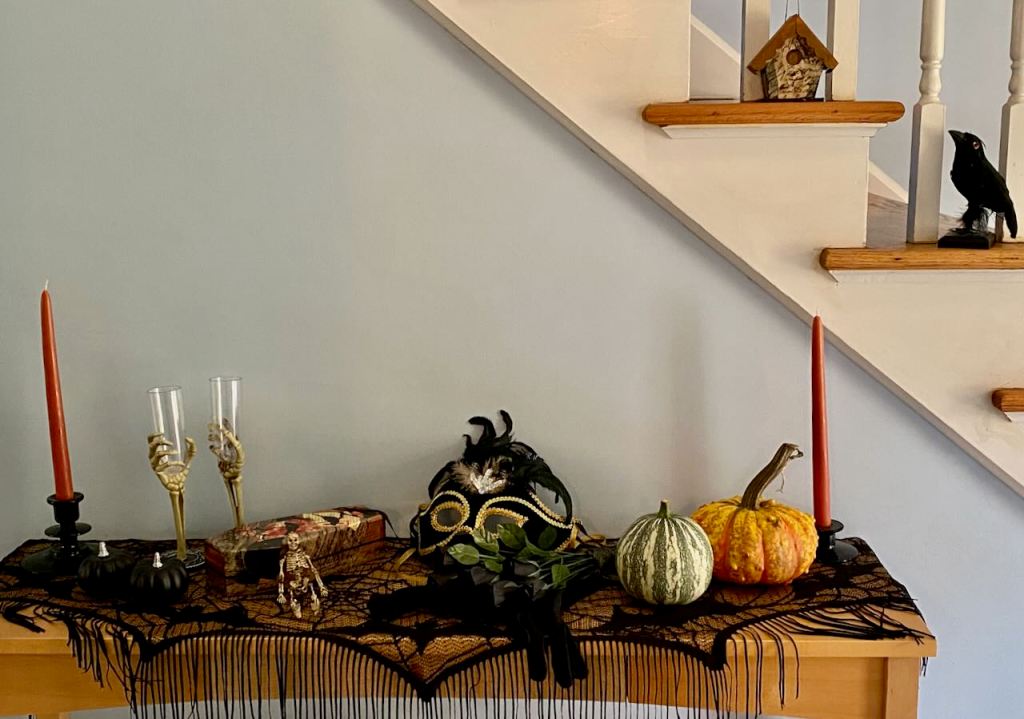 But Cinderella is hardly the only story this time of year. The hall table tells a different one every time I look at it, but definitely more Halloween than happily ever after. It’s pretty dark in that hallway, but another nice warty little orange guy and a green one with white stripes brightened it right up.