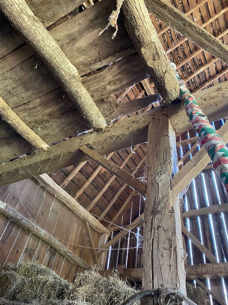 The farm has two barns, built over a hundred years ago on foundations of stones cleared from the land. The timber came from local maple trees, and was put together with mortise and tenon instead of nails. All of it, of course, done with hand tools. Right next to the old barns is a shiny new solar array which powers, among other things, a solar tractor, once an ordinary tractor, which they modified themselves.