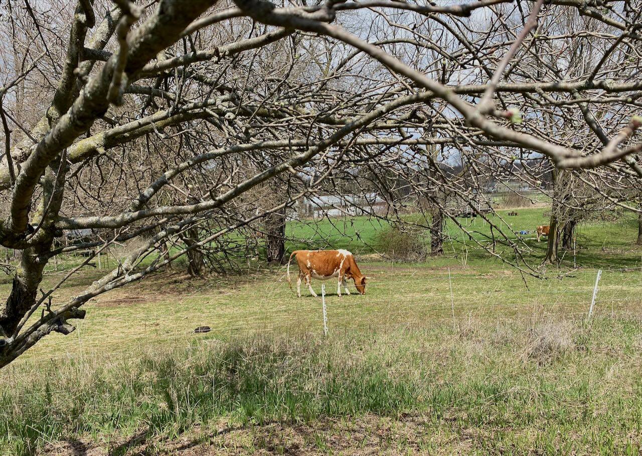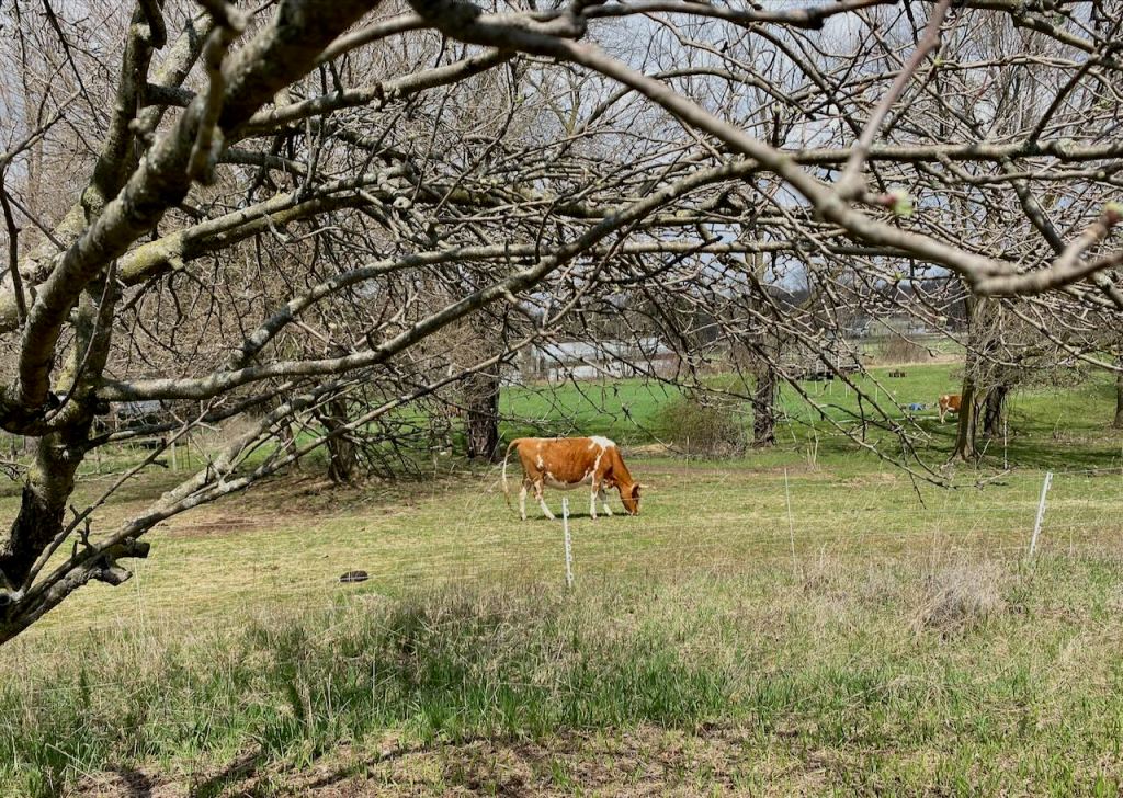 There were three cows out in a meadow, and when we learned they were not milked one of my friends said, Oh, they’re freeloaders. No, said Kacee, everyone on the farm works. They’re out there in the fallow field, browsing and fertilizing it for us. There were also three non-freeloading sheep and three non-freeloading goats. Advice on the farm’s website says, “it is best never to grab a goat’s horns, as it triggers a butting reflex.” Good to know my instinct was correct.