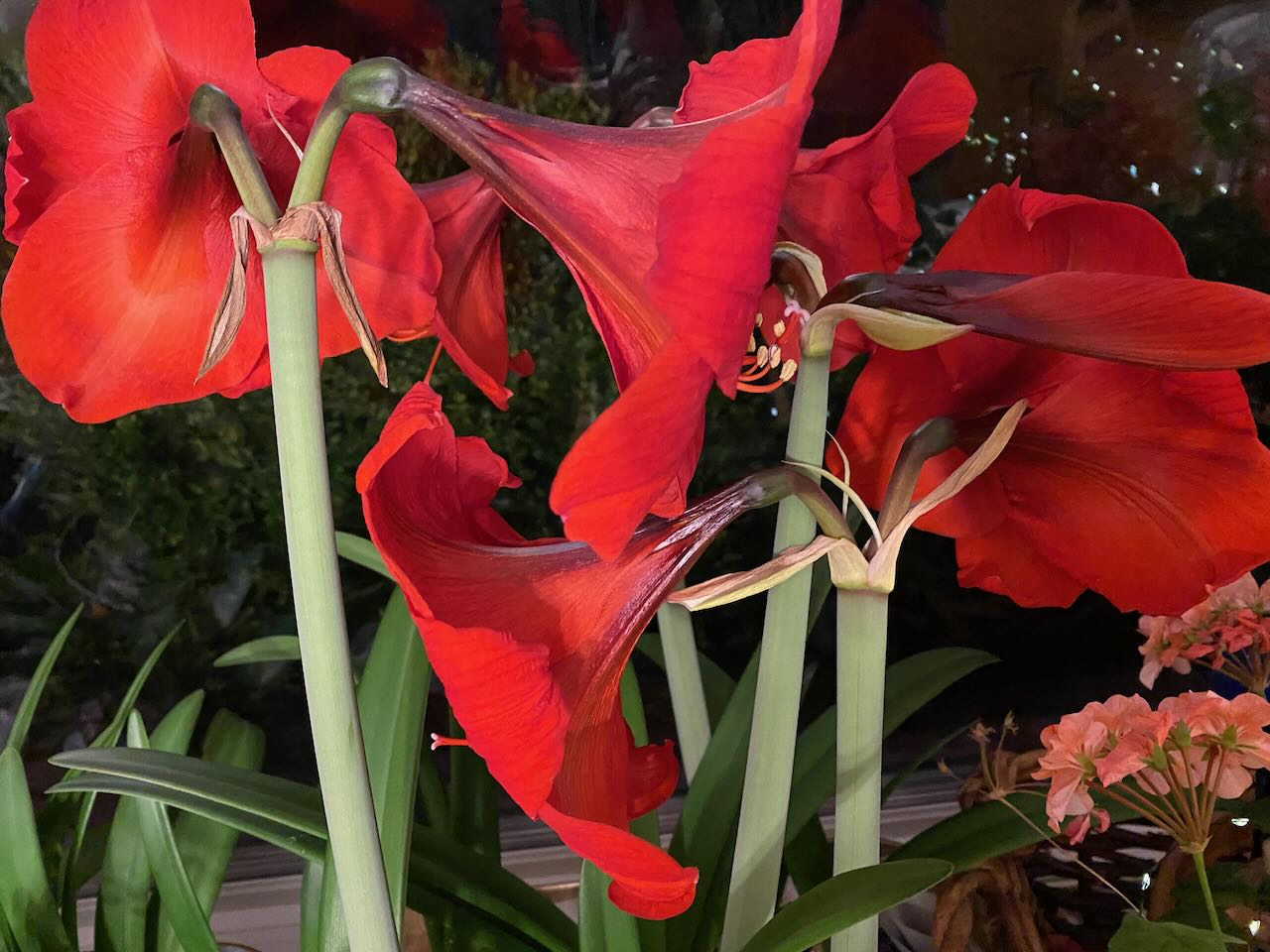I mostly keep the amaryllis going from year to year, setting them outdoors when the weather warms up, lifting and storing the bulbs indoors in the fall, and potting them up again after Christmas. But every year I lose one or two, so every year I buy one or two new ones.