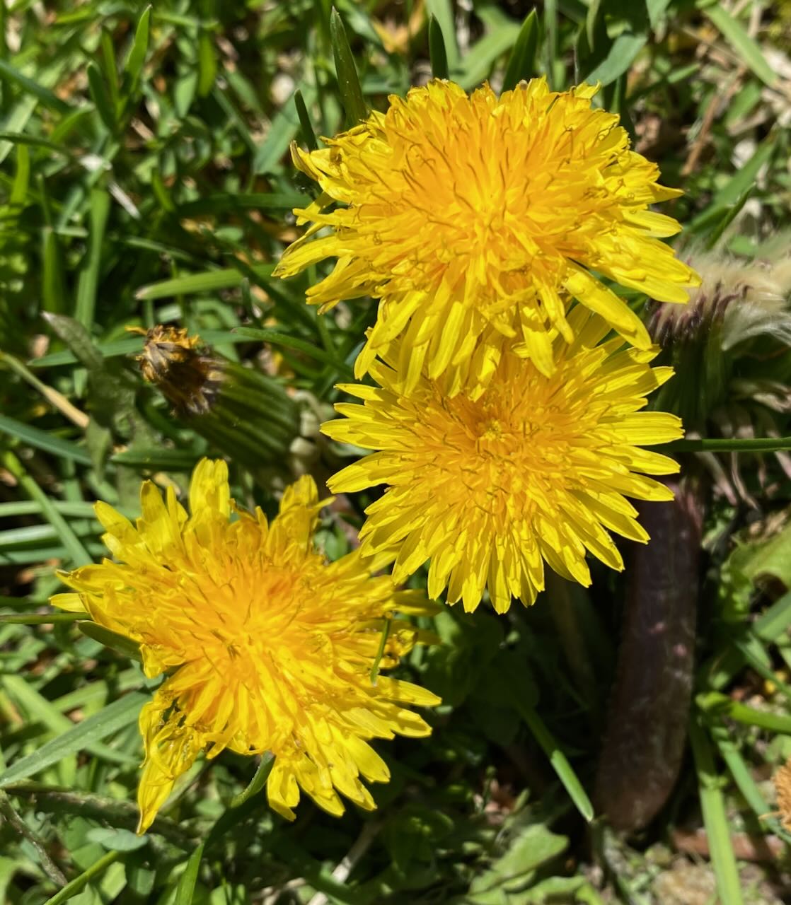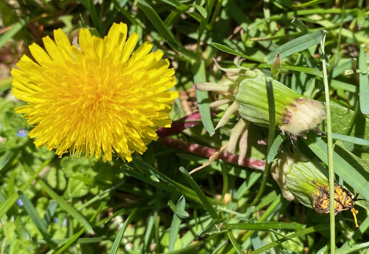Then over here, how did one tiny patch of forget-me-nots take over the entire flowerbed, even crowding out weeds? A blue haze under the fading spikes of daffodil leaves, it manages to be really in your face despite such tiny petals. It should be called I-dare-you-to-forget-mes.